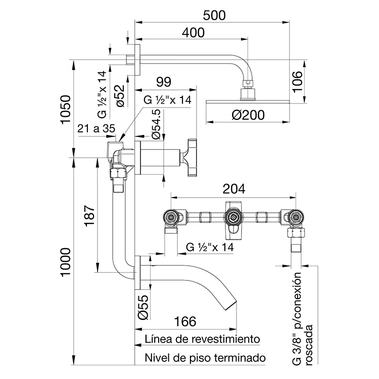 Juego para bañera y ducha, de dos llaves y transferencia, con ducha.