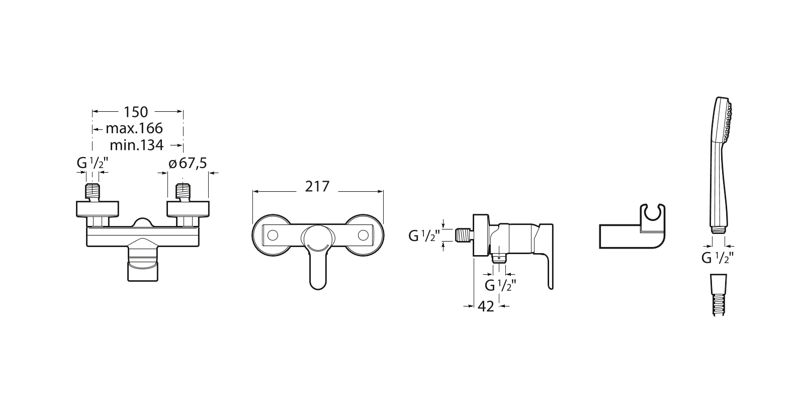 • Mezclador monomando exterior para ducha con ducha de mano, flexible de 1,50 m. y soporte de ducha articulado