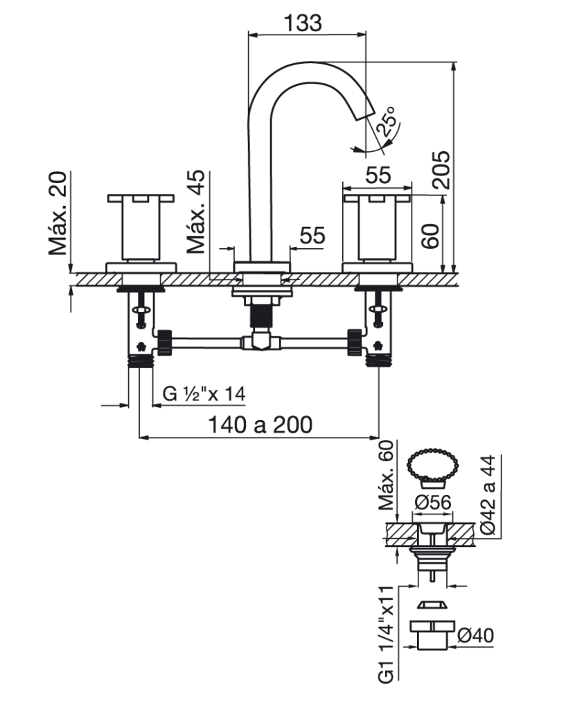 0.4 BAR y caudal mínimo de alimentación 20 lts porc minuto (en conexiones fría y caliente): Por pico Lavatorio 4,5 lts porc minuto. |