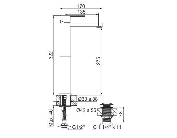 Juego monocomando alto para Lavatorio de apoyar, con desagüe “soft touch”.