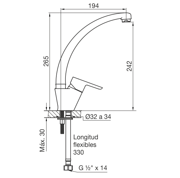 Juego monocomando para mesada de cocina, con pico móvil alto.
