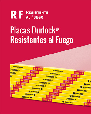 El núcleo de las placas de yeso Durlock® Resistentes al Fuego tiene la incorporación de aditivos especiales que proporcionan una mayor resistencia al mismo, preservando el mayor grado de integridad de la placa bajo su incidencia. Las placas Durlock® RF se identifican por su cinta protectora de bordes color rojo, siendo el papel de la cara expuesta de color rosa y el de la cara posterior de color más oscuro.