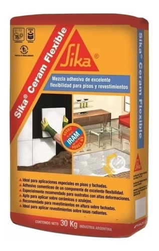 SikaCeram® Flexible es una mezcla Cementoícia adhesiva impermeable, tixotrópica, de muy buena plasticidad y altas prestaciones, en base a ligantes hidráulicos y arenas de granulometría controlada, con alta adición de polímeros, que le otorgan muy buena flexibilidad. Listo para su uso, solo se le agrega agua.
